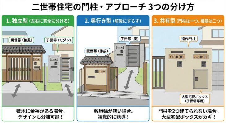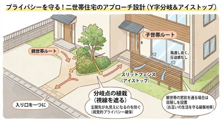 二世帯・大家族のプライバシーを守る。「ほどよい距離感」を保つアプローチと門柱の分け方